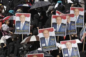 Yemeni women hold up posters of Abed Rabbo Mansour Hadi, the country's vice president and the only candidate in Tuesday's polls.