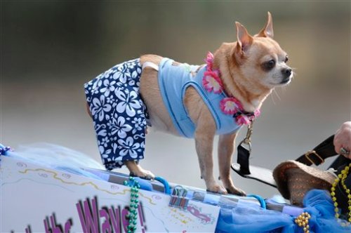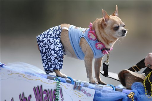 Beauregard, a Chihuahua, waits with his owner, Pat Day, at the start of the Mardi Gras Dog Parade held Sunday, February 19, 2012 at Baytowne Village in Sandestin, FL. Beauregard was dressed in surfer garb to reflect the theme of this year’s parade, “Fetch a Wave.” Just for doing that to Beauregard, I think Pat should be skinned, quartered and hung out to dry butt naked in the town square! And then, arrest her for indecent exposure. God save the animals! Photo courtesy Devon Ravine AP /Northwest Florida Daily.