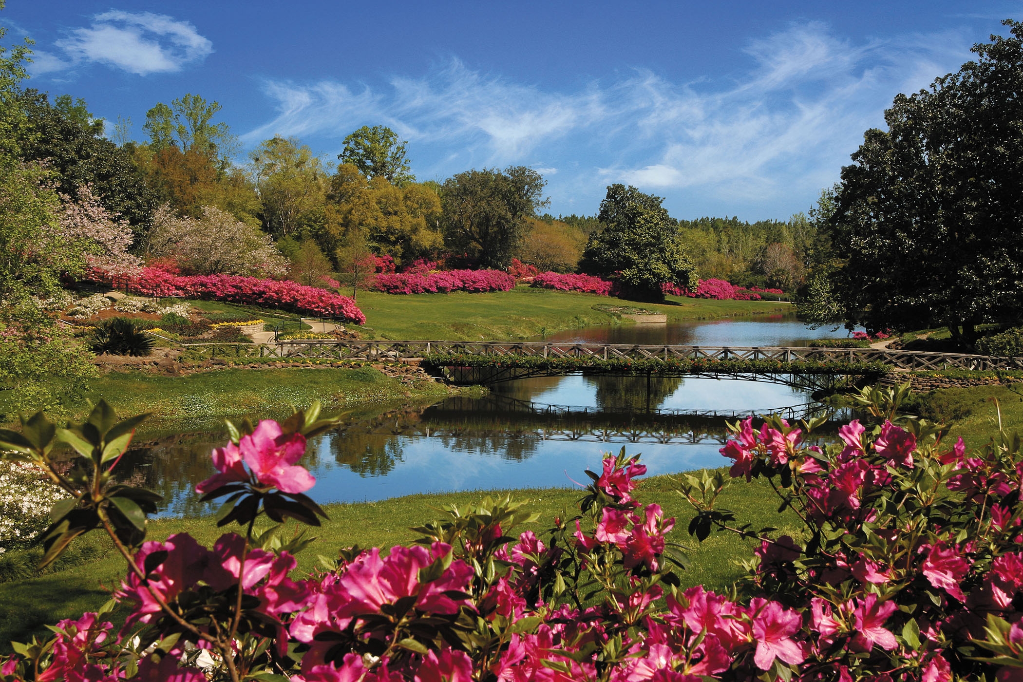 Azaleas adorn Mirror Lake at Bellingrath Gardens near Mobile, Alabama