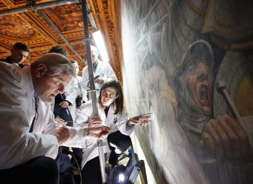 Researcher Maurizio Seracini (foreground) views video from behind a Giorgio Vasari mural in Florence. Art researchers are wondering if an undiscovered painting by Leonardo da Vinci is hidden behind a 16th century mural by fellow artist Giorgio Vasari. Photo courtesy of National Geographic.