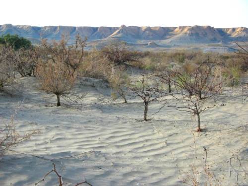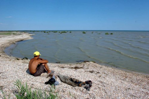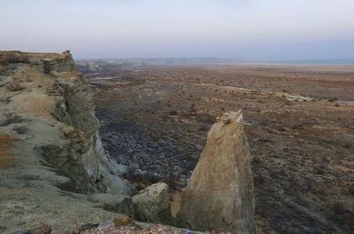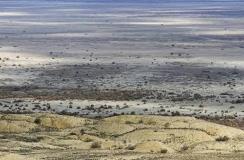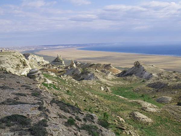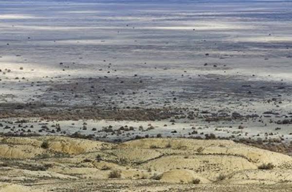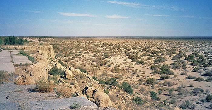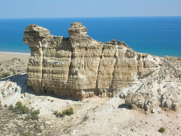 Locomotive Rock, seen here from the Ust-Urt Plateau on the western side of the South Aral Sea in September of 2005, used to be mostly underwater. Before the Aral Sea receded, Kazakh fishermen would climb the rock and leave fish as an offering for a good catch.