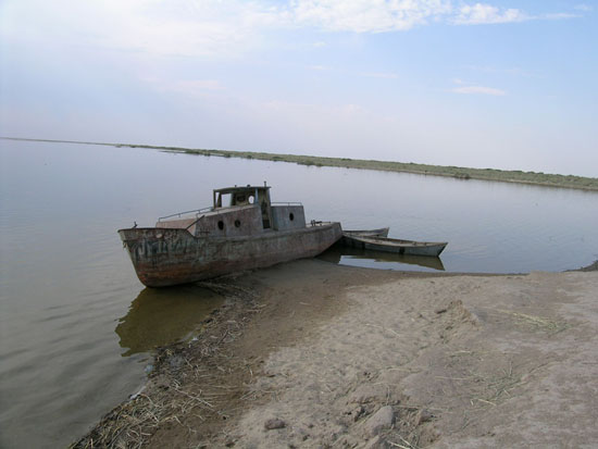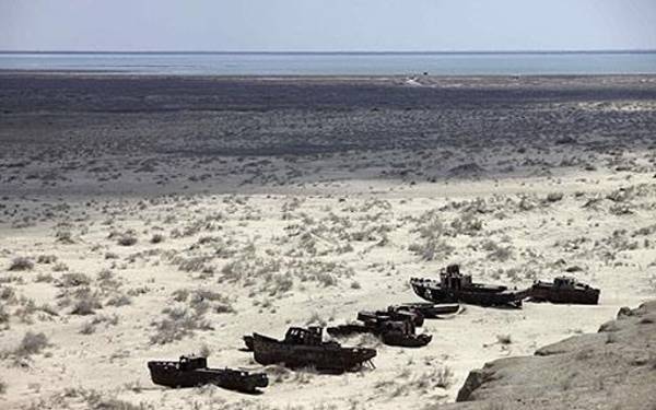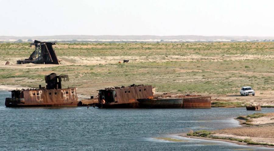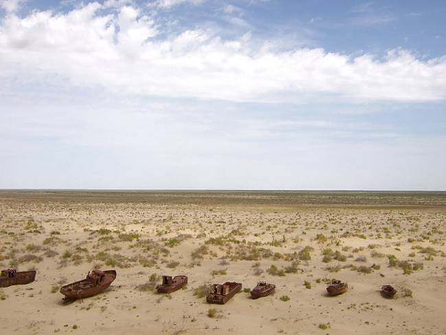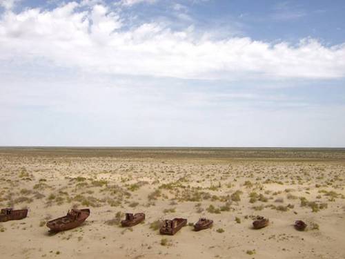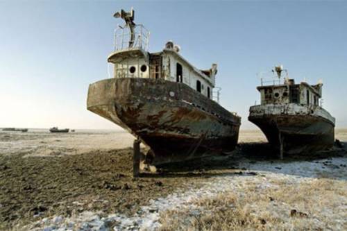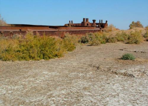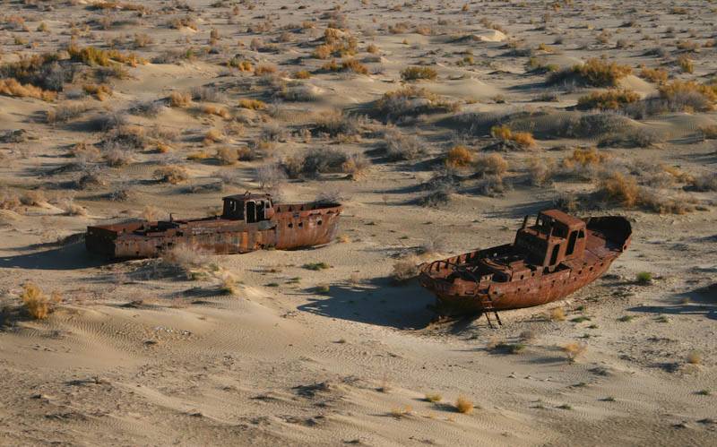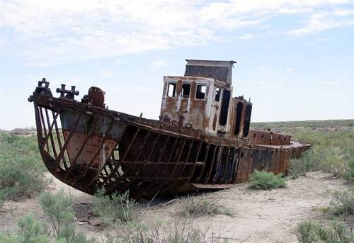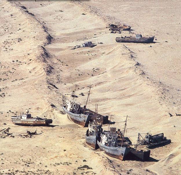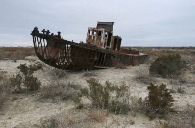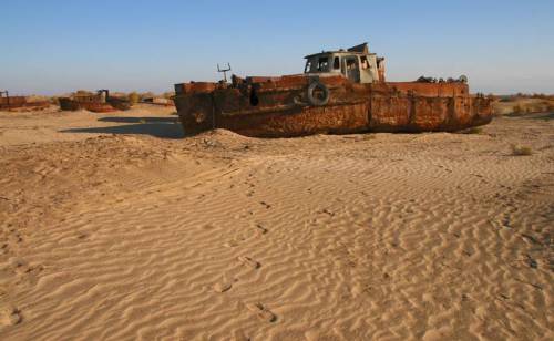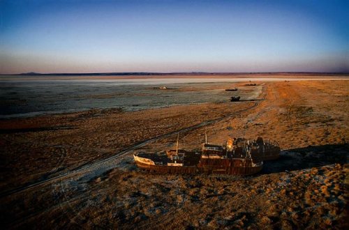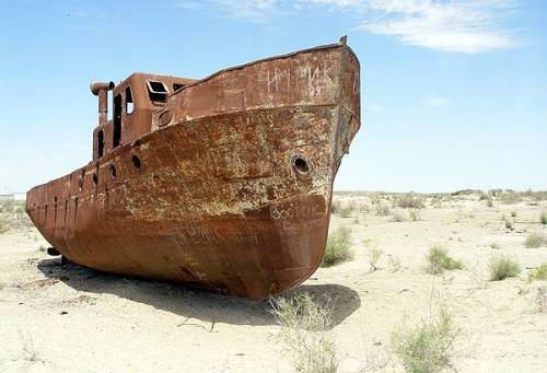 Located in Central Asia, the Aral Sea is bordered by Kazakhstan to the north and west and by Uzbekistan to the south and east.  It once was the fourth-largest inland sea, or salt-water lake, in the world, fed by the Amu Darya and Syr Darya Rivers.  Now, it is a mere fraction of its former self, reduced to less than a quarter of its original size.  Kazakhstan and Uzbekistan were part of the former Soviet Union and attained independence in the 1990’s, as the Soviet regime collapsed.  In the 1960’s, the Soviet government began damning up the Amu Darya and Syr Darya Rivers, as part of an expansive farming project.  But, the consequences were dire for the Aral Sea.  As its source waters were siphoned off, the Aral began to shrink, leaving a vast desert that has proven toxic for residents living near its former coastlines.  Efforts by Kazakhstan to restore as much of the sea are ongoing, but the situation is still dire.  Here are some photographs showing the refuse left behind, including plenty of ships that got stranded as the waters receded.