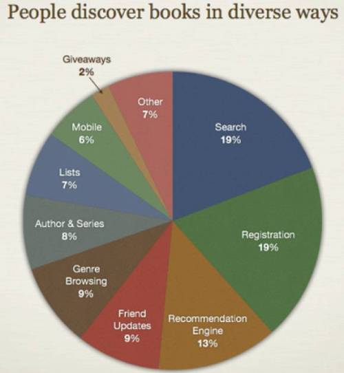 This pie graph displays the 10 primary means people discover books on Goodreads: