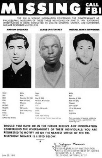 1964 – Three young civil rights workers, Michael Schwerner, Michael Goodman and James Chaney, working to register Black voters in Mississippi, were kidnapped and later killed by local members of the Ku Klux Klan.