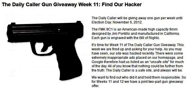 The Daily Caller web site is offering a free gun to anyone who can help them track down a hacker.