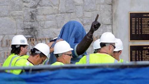– Verbiage on a sign flown by protesters in an airplane over the campus of Penn State University, urging campus officials to remove a statue of the late football coach Joe Paterno outside the football stadium.  The university quietly complied this past weekend.
