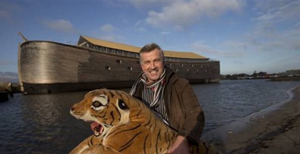 Huibers with a stuffed tiger and his “ark” in the background.