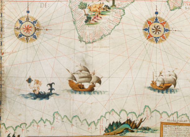 In a classic delineation, a siren admires herself in a mirror while surrounded by ships in the Southern Ocean on Pierre Descelier’s map from 1550. Other monsters can be seen on the nearby lands.
