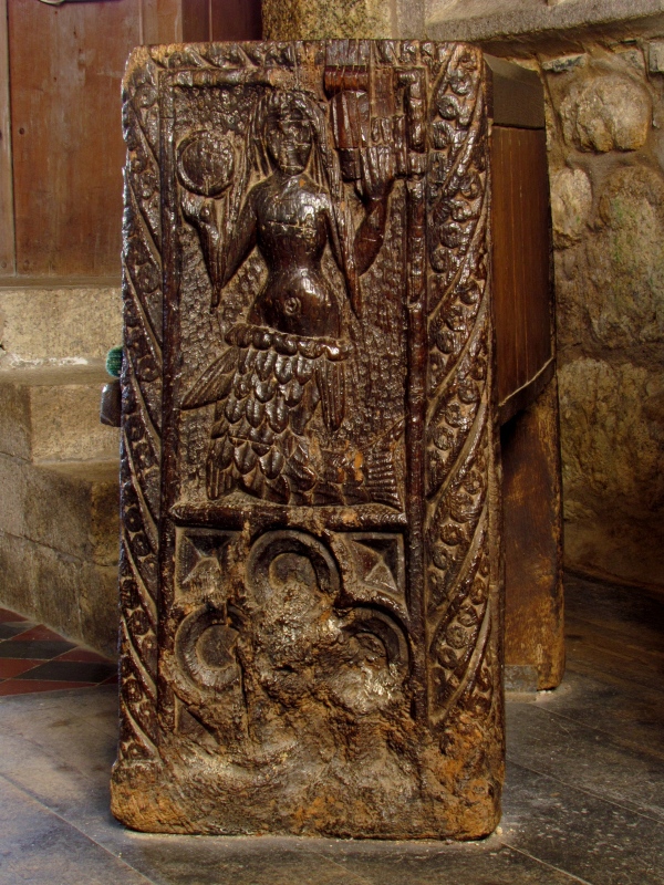 Wood carving of a mermaid on a bench in the Church of St. Senara, in the village of Zennor, West Cornwall, England.