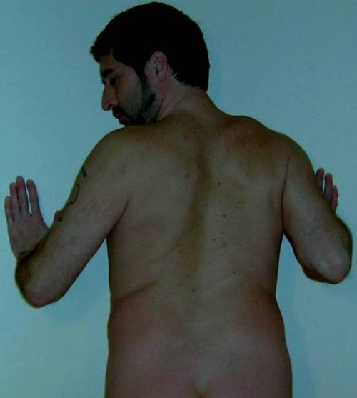 Naked man standing against the wall.