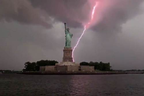 This is just one of a large number of photos captured by New York City area residents on July 23 of a lightning bolt striking near the Statue of Liberty.