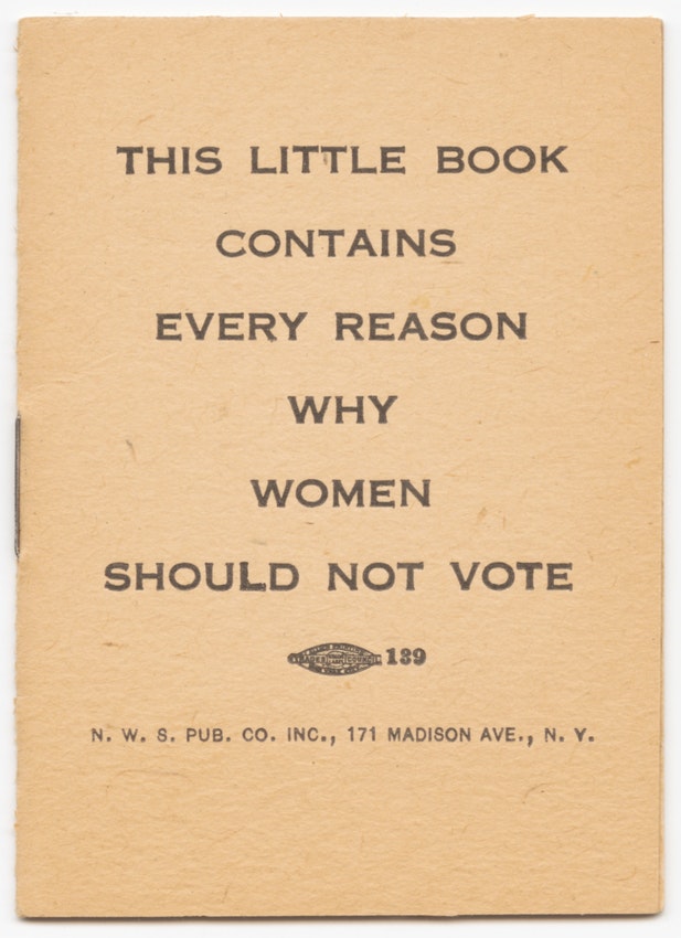 In 1917, the National Woman Suffrage Publishing Company (the publishing arm of the National Woman Suffrage Association) came out with “This Little Book Contains Every Reason Why Women Should Not Vote.” And all of its interior pages were blank. It was essentially a comical publication, but at its core was a serious message: there are no good reasons to deny women the right to vote.