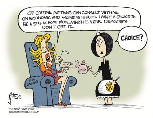 Like millions of American women, Ann Romney chose marriage and motherhood as her career. There was a time not too long ago, when that was really the only career choice women had. But, it’s not so much an individual choice as it is a blessing. Romney is fortunate to be married to a man who earns (actually, in his case, has) so much money that she doesn’t have to work. But, any woman in the same situation doesn’t make that selection on her own; her husband is the other half of the plan. Men have no choice but to work anyway, when they bring children into the world – unless he wants to be labeled a deadbeat dad and possibly imprisoned. Yes, motherhood is a full-time job – so is fatherhood, in case anyone hasn’t figured that out. But, it’s a different game being a parent and having a full-time job outside the home. Millions of women – and men – don’t have the privilege of staying home with their kids; they have to go to work.