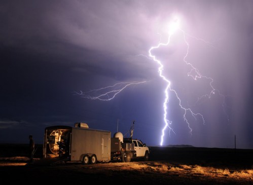 A cloud-to-ground lightning strike severs the sky near Los Lunas, New México. Tim Samaras and his crew chased the slow-moving storm cell until they ran out of road, and now can only watch as it moves on. Photograph by Carsten Peter, National Geographic.