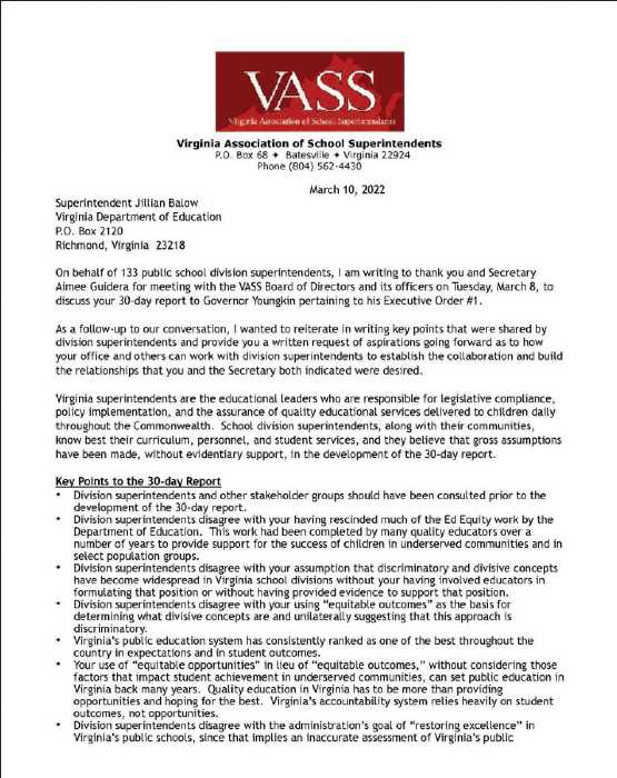 “Division superintendents disagree with your assumption that discriminatory and divisive concepts have become widespread in Virginia school divisions.”
