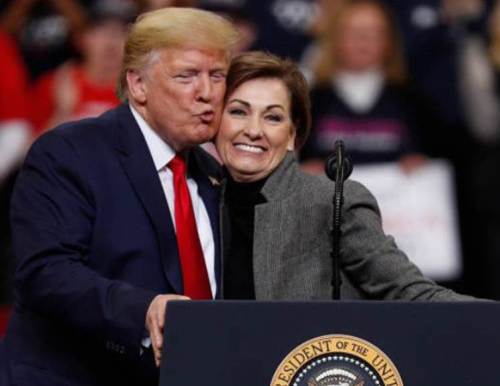 Donald Trump with Gov. Kim Reynolds at the Iowa Caucus this past January