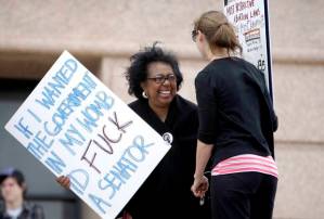 Oklahoma state Sen. Judy Eason McIntyre, left, holds a sign borrowed from a protester against the state’s “Personhood” bill outside her office.