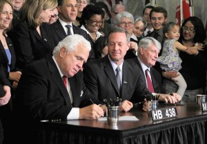 Maryland Senate President Thomas V. Mike Miller, Gov. Martin O’Malley and House Speaker Michael Busch, from left, sign the state’s same-sex marriage bill into law at the Maryland State House in Annapolis. Photo: Alex Wong, Getty Images