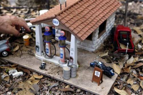 Ron Natinsky rearranges a miniature gas station in preparation for the pond tour on Saturday and Sunday.