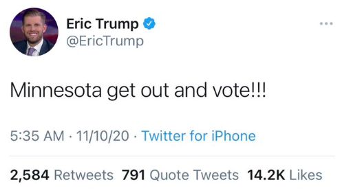 Eric Trump, Donald Trump’s second-oldest son, had a message for Minnesota voters – one week after the elections.