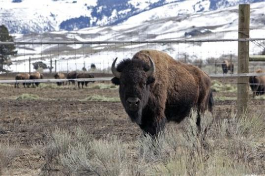 In this March 17, 2011, file photo, a free bison roams around the outside of a pen enclosing bison in Gardiner, MT, in Yellowstone National Park. AP Photo/Janie Osborne, File.